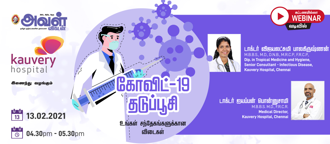 அவள் விகடன் மற்றும் காவிரி மருத்துவமனை இணைந்து நடத்தும் ‘கோவிட்-19 தடுப்பூசி - உங்கள் சந்தேகங்களுக்கான விடைகள் என்ற ஆன்லைன் பயிலரங்கில் தங்கு தடையின்றிப் பங்கேற்க, கீழுள்ள குறிப்புகளை மறக்காமல் பின்பற்றுங்கள்!