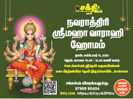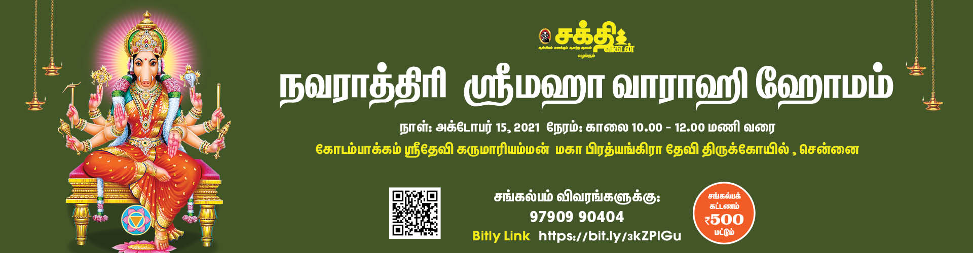 முப்பெருந்தேவியரையும் வழிபடும் நவராத்திரி நாள்களில் ஸ்ரீவாராஹி அம்மனை வழிபடுவது மிகவும் சிறப்பானது என்பர். இதனால் சென்னை கோடம்பாக்கம் ஸ்ரீதேவி கருமாரியம்மன் மகா பிரத்யங்கிரா தேவி திருக்கோயில் மற்றும் சக்தி விகடன் இணைந்து வாசகர்களுக்காக நவராத்திரி இறுதி நாளான விஜயதசமி நன்னாளில் (15-10-21) வெள்ளிக்கிழமை காலை 10 மணி முதல் 12 மணி வரை ஸ்ரீமகா வாராஹி ஹோமம் நடைபெற உள்ளது. இந்த ஹோமத்தில் சங்கல்பித்து வழிபட்டால் வளமான வாழ்வும் தடையற்ற முன்னேற்றமும் கிடைக்கும். எடுத்த காரியத்தில் வெற்றியும் எதிரிகளற்ற வாழ்வும் உண்டாகும். சகல நோய்களும் தோஷங்களும் நீங்கி நலம் உண்டாகும்.