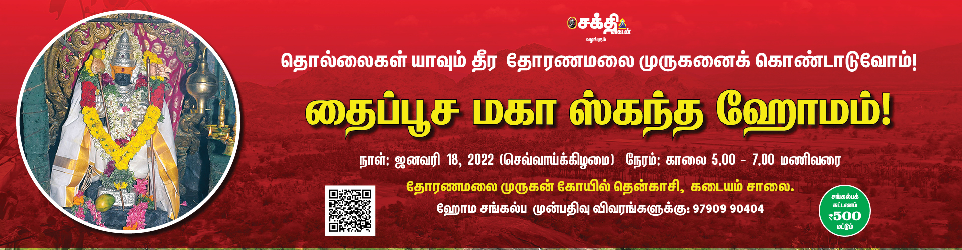 தென்காசியிலிருந்து கடையம் போகும் வழியில், அமைந்திருக்கிறது தோரணமலை. அகத்தியர் இங்கு தங்கி பல மூலிகைகளை ஆய்வு செய்திருக்கின்றார் என்பார்கள். அகத்தியரின் சீடரான தேரைய சித்தர் இங்கு அருவுருவமாக இருந்து பக்தர்களின் குறைகளைத் தீர்ப்பதாக ஐதீகம். தைப்பூசத்திருநாள் இங்கு விசேஷம் எனலாம். அதில் முருகப்பெருமானை ஆராதிக்கும் ஸ்ரீமகா ஸ்கந்த ஹோமம் மிகவும் விசேஷமானது. இதில் கலந்து கொண்டால் சகல துன்பங்களும் நீங்கி ஐஸ்வரியங்கள் பெருகும் என்பது நம்பிக்கை.