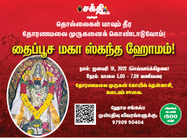 இங்கு நடைபெறும் தைப்பூச திருவிழாவையொட்டி நாள் முழுவதும் பல ஆராதனைகள் நடைபெற உள்ளன. அதில் உட்சபட்ச ஆராதனையாக மகாஸ்கந்த ஹோமம் நடைபெற உள்ளது. இதில் கலந்து கொண்டால் தடைப்பட்ட திருமணங்கள் நடக்கும், குழந்தை பாக்கியம் பெறுவர், கடன் தொல்லை கொண்டவர்கள் விடுபடுவர், பல்வேறு தோஷங்கள்-துன்பங்கள் கொண்டவர் பலன் பெறுவர் என்று உறுதியாகச் சொல்லப்படுகிறது. துன்பங்கள் நீங்கி, இன்பங்கள் சூழ இந்த இனிய வைபவத்தில் கலந்து கொள்வோம்!