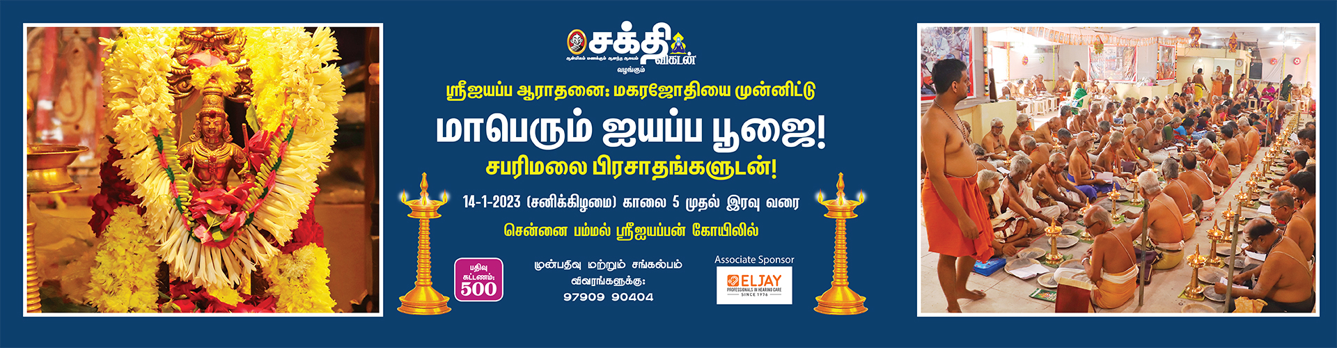 சென்னையில் ஸ்ரீஐயப்பன் சபரிமலை ஐயனைப் போலவே வீற்றிருக்கும் திருத்தலம் பம்மலில் அமைந்துள்ளது.. மழலை வரம் அருளும் விசேஷத் திருத்தலமான இங்கு மகரஜோதி விழா சிறப்பானது. இந்த ஆண்டு உங்களுக்காக பிரமாண்ட ஏற்பாடுகளுடன் சபரிமலை பிரசாதங்களுடன் விழா நடைபெற உள்ளது. இந்த விழாவில் சங்கல்பித்துக் கொண்டால் சகல வேண்டுதல்களும் நிறைவேறும் என்பது நம்பிக்கை.