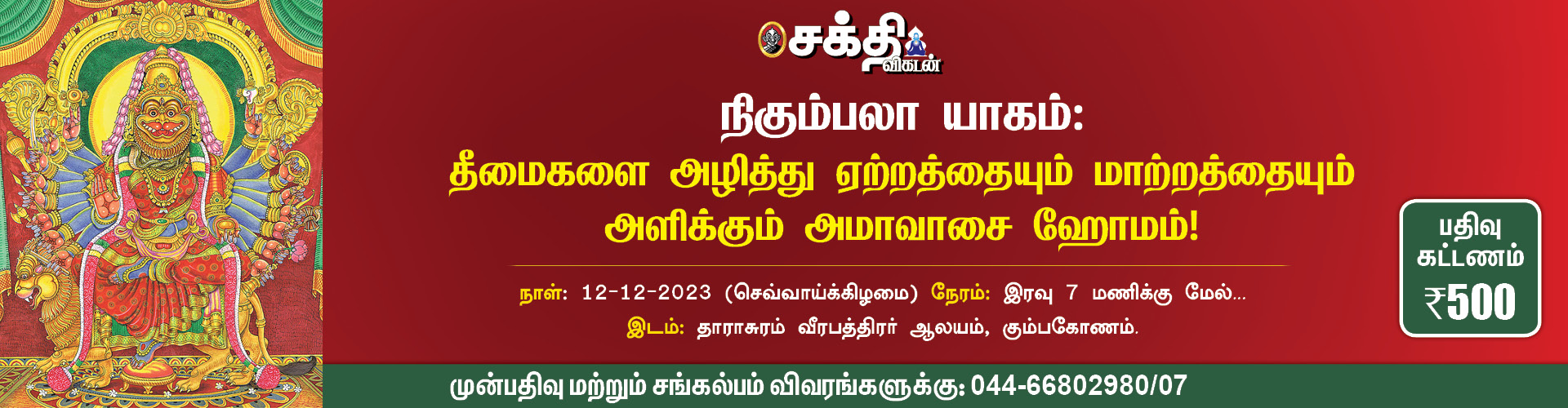 கார்த்திகை அமாவாசை நாளில் (12-12-2023 - செவ்வாய்க்கிழமை) சக்திவிகடனும் தாராசுரம் வீரபத்திரர் ஆலய நிர்வாகமும் இணைந்து நிகும்பலா யாகம் நடத்தவுள்ளோம். பத்ரகாளியும் வீரபத்திரரும் தட்சனின் யாகத்தை அழித்து, தட்சனை ஒழித்து இங்கே வந்து கோயில் கொண்டனர் என்கிறது தலவரலாறு. இங்கு வந்தால் சகல அச்சங்களும் நீங்கி, எதிரிகள் விலகியோட நன்மைகள் உண்டாகும் என்கிறார்கள். அதோடு அமாவாசை இரவில் நடைபெறும் நிகும்பலா ஹோமத்தில் கலந்து கொண்டால் மங்கல வாழ்வும் நிறைந்த செல்வமும் நீங்காத ஆரோக்கியமும் கிட்டும் என்பது ஐதீகம்.