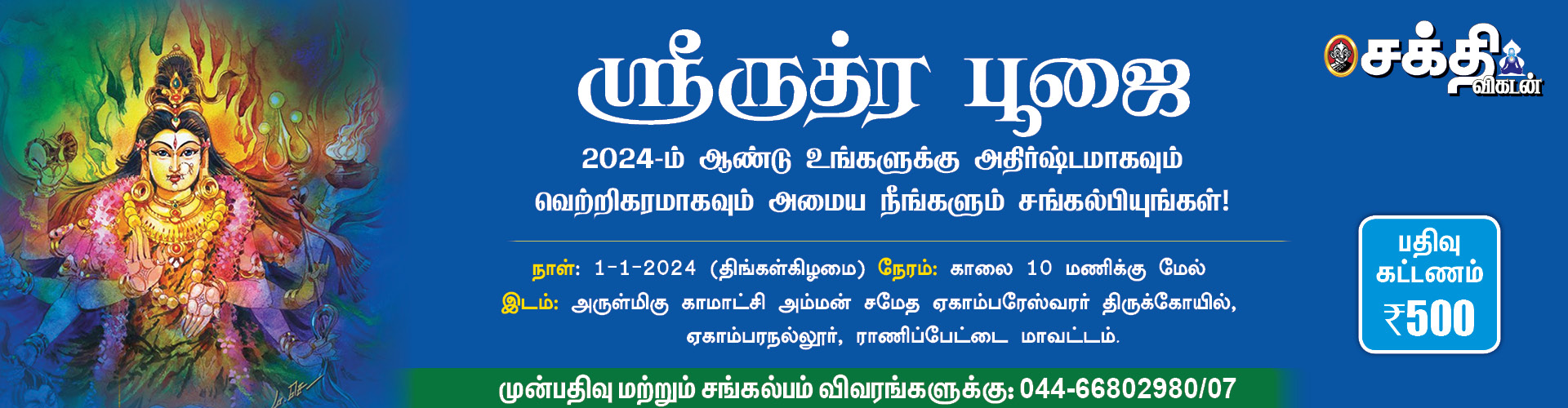2024 ஆங்கிலப் புத்தாண்டில் தேய்பிறை பஞ்சமி நாளில் சோமவாரத்தில் சக்திவிகடனும் ஏகம்பரநல்லூர் ஏகாம்பரேஸ்வரர் ஆலய நிர்வாகமும் இணைந்து ருத்ர பூஜை நடத்தவுள்ளோம். காஞ்சிக்கு முன்னரே இங்கு காமாட்சியோடு எழுந்தருளிய ஈசன், அஷ்ட பைரவர்களுக்கும் இங்கே எண்திசை காவலர் பொறுப்பை அளித்தார் என்கிறது தலவரலாறு. இங்கு வந்து ஏகாம்பரரை தரிசித்தால் சகல தோஷங்களும் பாவங்களும் நீங்கி சந்தோச வாழ்வைப் பெறலாம் என்பது நம்பிக்கை. குறிப்பாக எதிர்கால வாழ்வு என்னாகுமோ என்று அச்சம் கொண்டவர்கள் இங்கு வந்து வணங்க, அவர்களின் வாழ்வே ஆனந்தமயமாகும். இங்கு நடக்கும் ருத்ர பூஜையில் நீங்களும் சங்கல்பித்துக் கொண்டால் இந்த 2024-ம் ஆண்டு உங்களுக்கு அதிர்ஷ்ட மற்றும் வெற்றி அளிக்கும் ஆண்டாக அமையும் என நம்பலாம்.