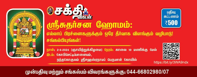 2024 ஜூன் 2-ம் நாள் ஞாயிற்றுக்கிழமை சர்வ ஏகாதசி சுபயோக சுபயோக நேரத்தில் ஸ்ரீசுதர்சன ஹோமம் நடைபெற உள்ளது. ஈரோடு மாவட்டம் கோபிசெட்டிபாளையம் கோடீஸ்வரா நகரில் தக்ஷிண பிருந்தாவனம் அமைந்துள்ளது. இங்குதான் நந்த கோகுலம் எனும் கோசாலையும் சஹஸ்ரநாமப் பெருமாள் கோயிலும் அமைந்துள்ளன. முற்காலத்தில் ஞானிகளும் தபஸ்விகளும் போற்றிய இந்த இடத்தில் மீண்டும் ஸ்ரீராமராக, ஸ்ரீகிருஷ்ணராகவும் தேவியர் புடை சூழ எழுந்தருளி உள்ளார் விஷ்ணு. இங்கு நடைபெறும் ஸ்ரீசுதர்சன ஹோமத்தில் சங்கல்பித்துக் கொண்டால் சகல சௌபாக்கியங்களும் கைகூடும். ஆரோக்கியம், ஆயுள், அபிவிருத்தி, மணப்பேறு, குழந்தைப்பேறு உள்ளிட்ட சகல நன்மைகளும் கிட்டும். தீமைகள், தோஷங்கள் விலகி , சந்தோசம் பெருக இந்த சுதர்சன ஹோமம் நிச்சயம் உதவும் என்கின்றன ஞான நூல்கள்.