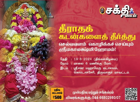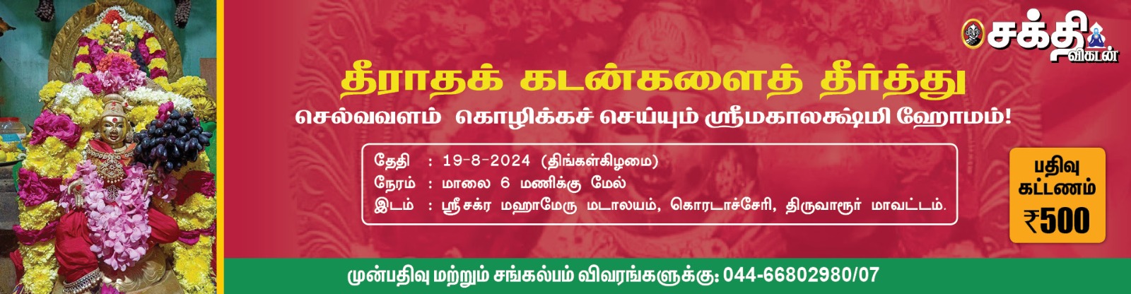 2024 ஆகஸ்ட் 19-ம் நாள் திங்கள்கிழமை ஆவணி மாத பௌர்ணமி நாளில் கொரடாச்சேரி ஸ்ரீசக்ர மஹாமேரு மடாலயத்தில் ஸ்ரீமகாலஷ்மி ஹோமம் மற்றும் ஸ்ரீலலிதா சஹஸ்ரநாமப் பாராயணம் நடைபெற உள்ளது. அகிலாண்டகோடி பிரமாண்ட நாயகியும் ஸ்ரீஅம்பாள் இங்கே சிரசில் ஸ்ரீசக்ரம் தாங்கி தன்னை சரண் அடைந்தவர்களுக்கு சகலமும் வழங்கும் தாயாக இருக்கிறாள். வரும் பௌர்ணமி நாளில் இங்கு நடைபெறும் ஸ்ரீமகாலஷ்மி ஹோமத்தில் சங்கல்பித்துக் கொண்டால் தீராத கடன்கள் தீரும்; வாட்டும் வியாதிகள் நீங்கும்; மேலும் கவலைகளும் தரித்திரமும் நீங்கி, ஆயுளும் ஐஸ்வர்யமும் கூடும் என்கிறார்கள்.
