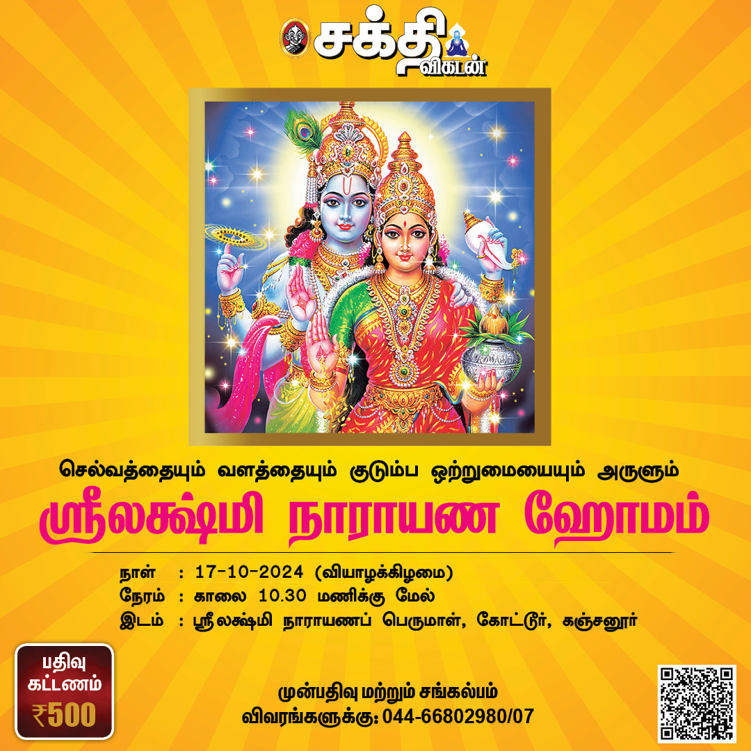 2024 அக்டோபர் 17-ம் நாள் வியாழக்கிழமை புரட்டாசி மாத பௌர்ணமி நாளில் தஞ்சாவூர் மாவட்டம், கஞ்சனூர் கோட்டூரில், ஸ்ரீலக்ஷ்மி நாராயணப் பெருமாள் ஆலயத்தில் ஸ்ரீலக்ஷ்மி நாராயண ஹோமம் நடைபெற உள்ளது. திருமகளோடு ஒன்றாக கருவறையில் பெருமாள் அருள்வதால் இங்கே வணங்கி ஹோமத்தில் சங்கல்பித்துக் கொண்டால் செல்வத்தையும் வளத்தையும் குடும்ப ஒற்றுமையையும் பெறலாம் என்பது நிச்சயம். மேலும் செல்வாக்கு, சொல்வாக்கு பெருகும். கடன்கள் தீரும்; வியாதிகள் நீங்கும்; கவலைகளும் தரித்திரமும் நீங்கி, ஆயுளும் ஐஸ்வர்யமும் கூடும். குறிப்பாக தடைபட்ட மங்கல காரியங்கள் நடைபெறும்.