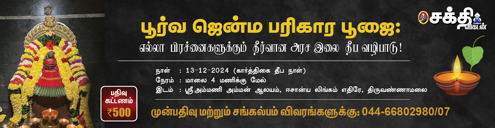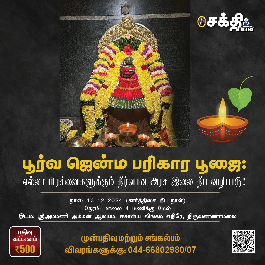 2024 டிசம்பர் 13-ம் நாள் வெள்ளிக்கிழமை ஐப்பசி திருக்கார்த்திகை தீபத்திருவிழா நன்னாளில் திருவண்ணாமலை கிரிவலத்தில் ஈசான்ய லிங்கத்துக்கு எதிரே அமைந்துள்ள ஸ்ரீஅம்மணி அம்மன் ஆலயத்தில் பூர்வ ஜென்ம பரிகார பூஜை நடைபெற உள்ளது. தமிழகத்தில் முன் ஜென்ம கர்ம தோஷங்களை போக்கும் ஆற்றல் கொண்டதாக 7 ஆலயங்கள் கருதப்படுகின்றன. அவை திருபுவனம், திருப்பாம்புரம், திருத்தேவன்குடி, திருவிடைமருதூர், வைத்தீஸ்வரன்கோவில், கும்பகோணம் ராமநாதசாமி கோயில், திருவண்ணாமலை அம்மணி அம்மன் கோயில். அம்மணி அம்மன் ஆலயத்தில் அரச இலை தீப வழிபாடு பூர்வ ஜென்ம பரிகார பூஜையாக அமையும் என்பது சித்தர்கள் வாக்கு.
