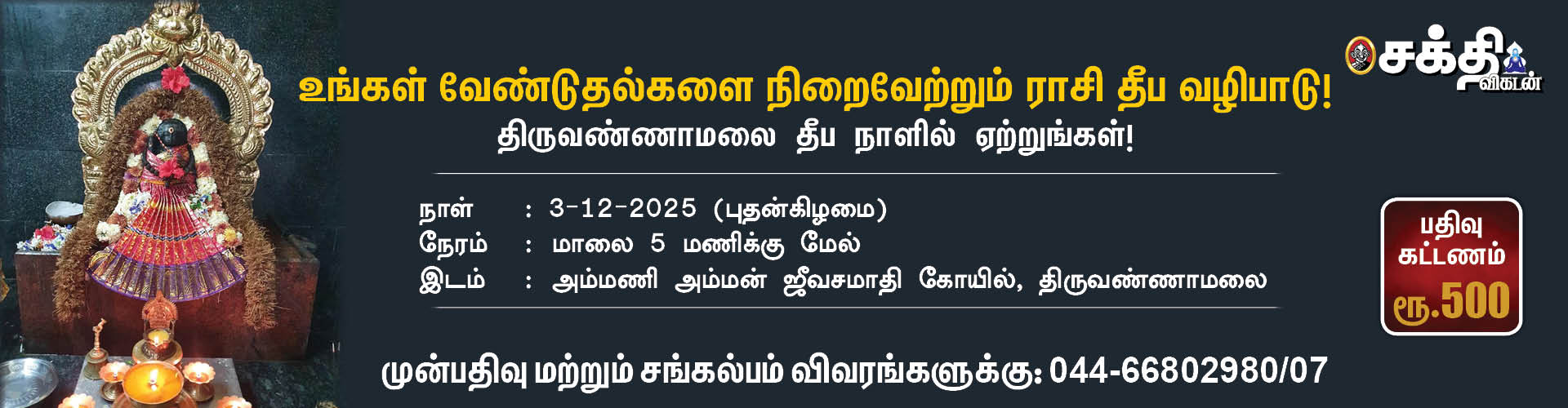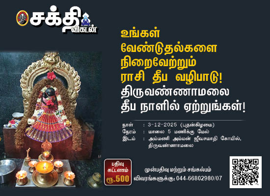 திருவண்ணாமலைத் தீப விழாவை ஒருமுறை தரிசித்தாலே உங்களின் 21 தலைமுறைக்கும் புண்ணியம் அளிக்கும் என்று தல புராணத்தில் கூறப்பட்டுள்ளது. அதற்காகவே இம்முறை வரும் டிசம்பர்-3ம் தேதி கார்த்திகை தீப நன்னாளில் உங்கள் சக்தி விகடனோடும் அம்மணி அம்மன் ஆலயமும் இணைந்து ராசி தீப வழிபாடு நடத்த உள்ளது. இங்கு பதிவு செய்யும் ஒவ்வொரு நபரின் பெயருக்கும் ராசிக்கும் சிறப்பு தீபம் ஏற்றி, அபூர்வ ஸ்படிக லிங்க அபிஷேகம் செய்யப்படும். இதனால் உங்கள் கவலைகளும் அச்சங்களும் நீங்கி வாழ்வில் புதிய இன்பம் பெருகும். இந்த சிறப்பு வழிபாட்டில் கலந்து கொண்டால் ஆயுளும் ஐஸ்வர்யமும் கூடும்.