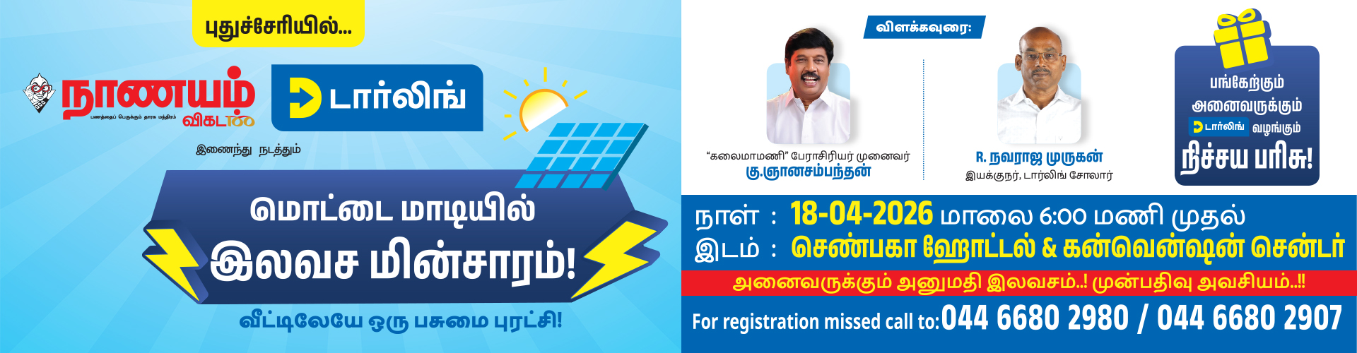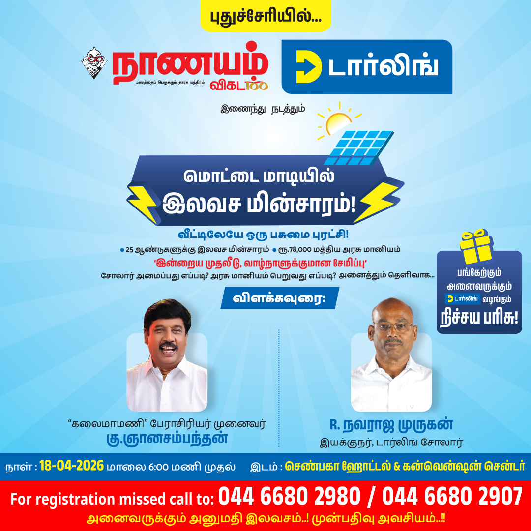 நாணயம் விகடன் மற்றும் டார்லிங் சோலார் இணைந்து நடத்தும் மொட்டை மாடியில் இலவச மின்சாரம்! வீட்டிலேயே ஒரு பசுமை புரட்சி!